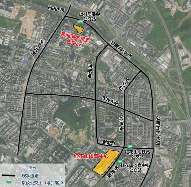 可导航定位至“红花山体育中心”或 “茅洲河体育艺术中心”接驳点,按照标识指引牌前往接驳公交上客点,换乘对应赛事接驳公交专线直达比赛场馆。